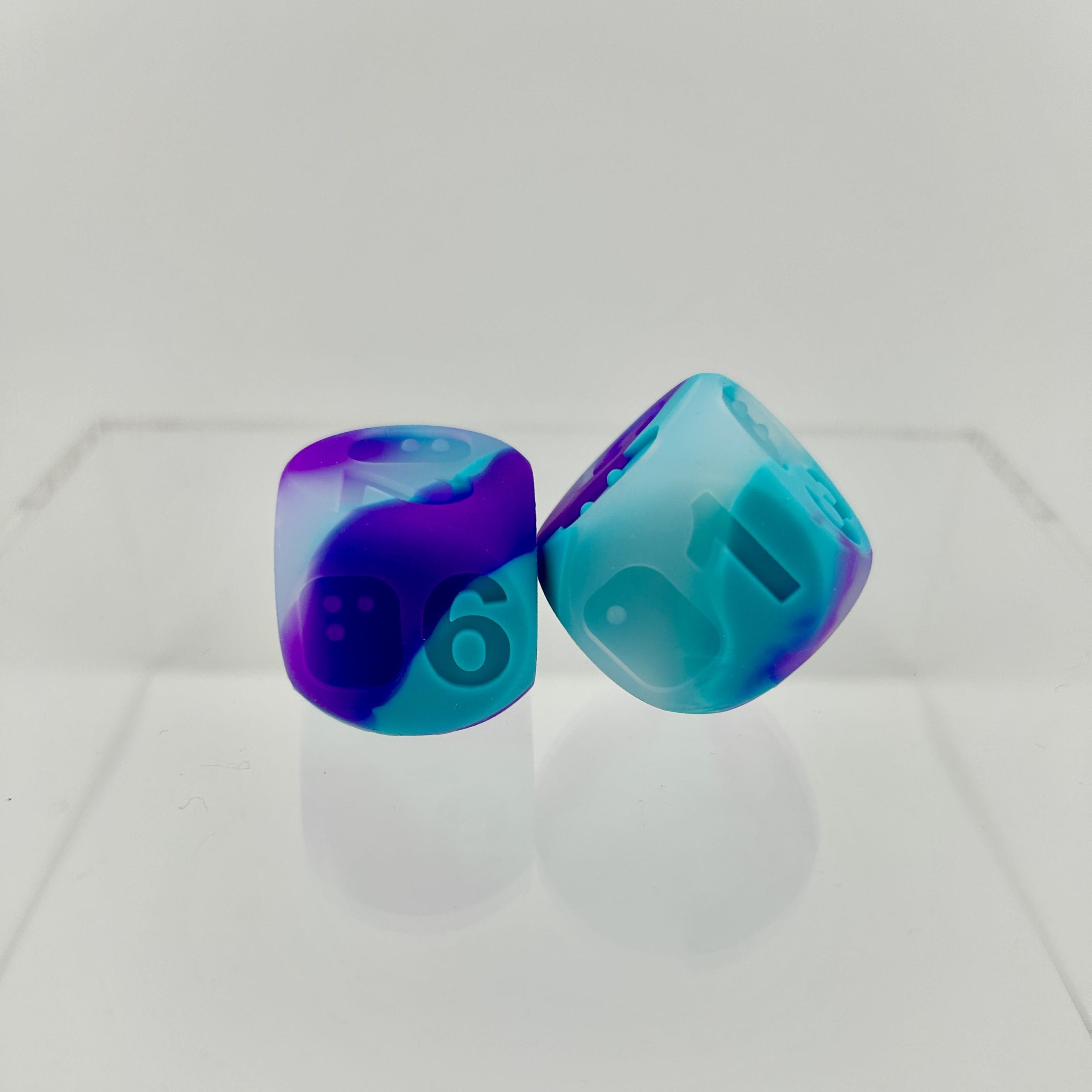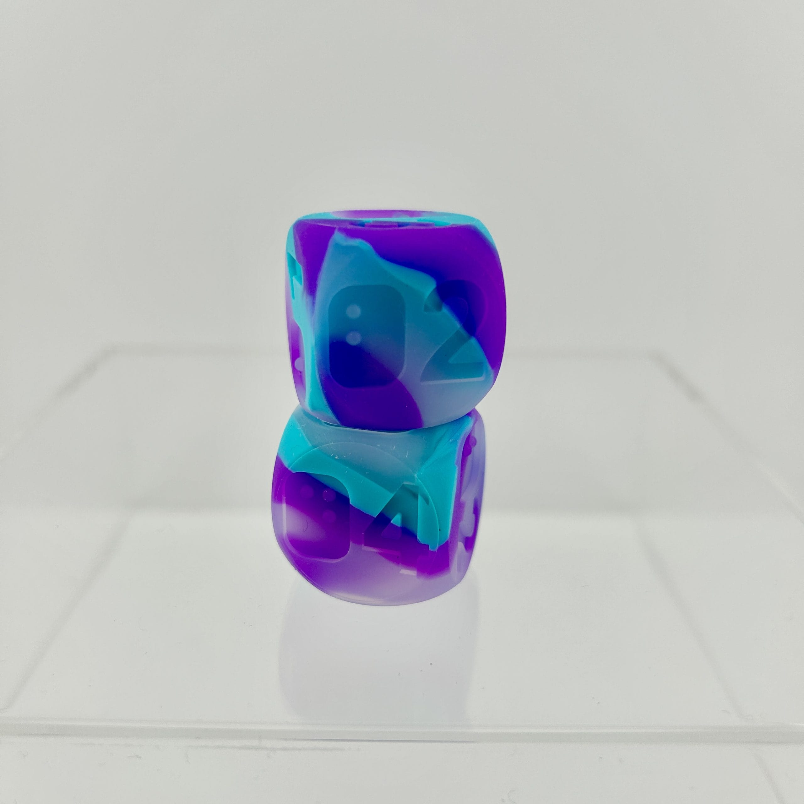 Our original, patented D6 Titans model with a new softer silicone texture in tandem with our new Oceansong (teal, purple, transparent swirl) colorway. It features our Jumbo D6 (25mm) design and equally jumbo braille cell. Each set includes 2 pieces nestled safely in a PVC tube.