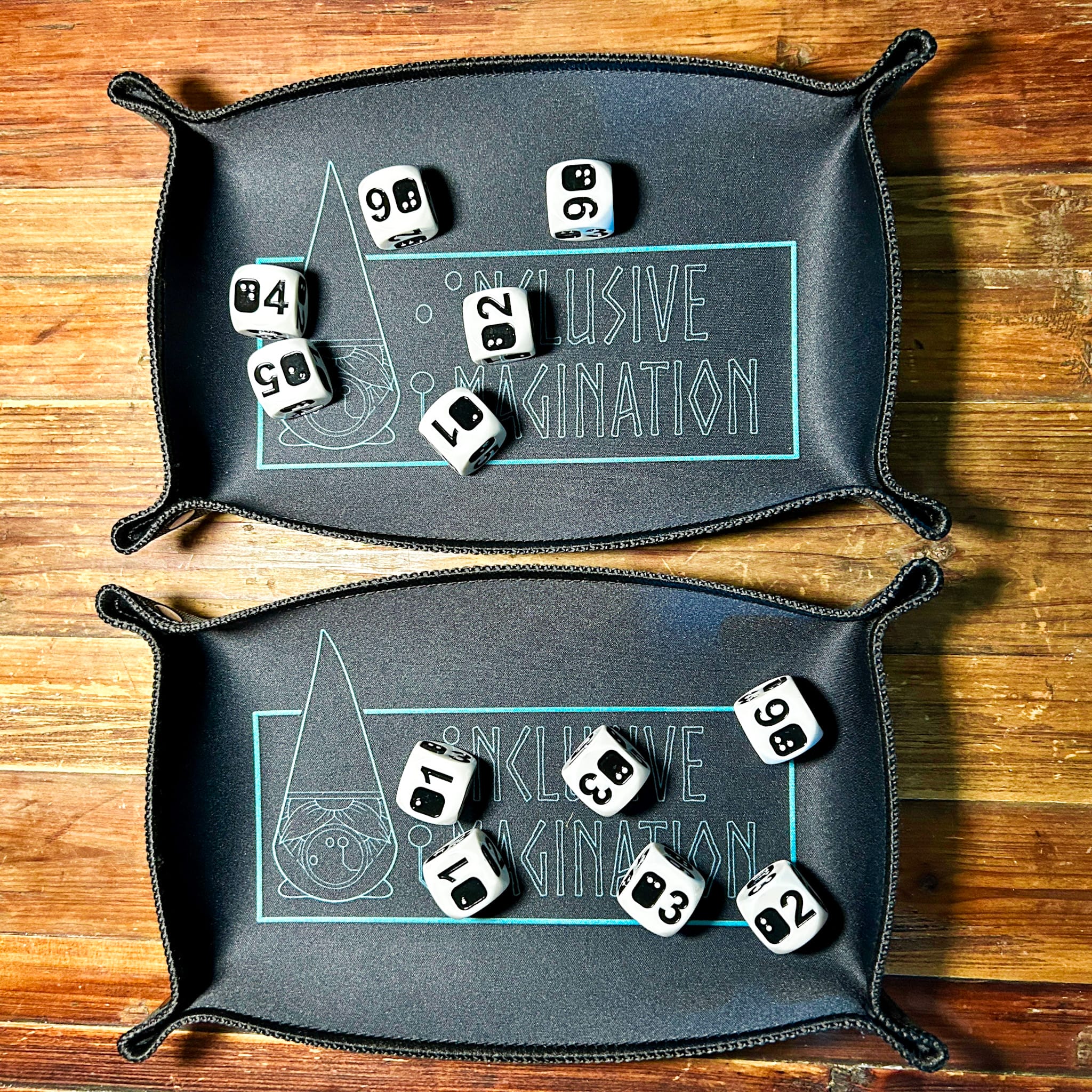 Level up game night—for two. This bundle brings together two full sets of our D6 Level Up Classic dice (12 total dice!) and two Black Rectangle Dice Trays with vibrant azure logo for side-by-side rolling.
